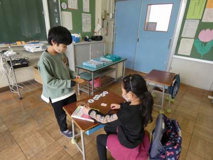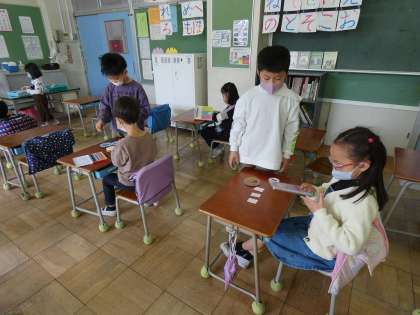 あめは、55円です。50円玉であめは、買えますか。多い、少ないの学習の発展に取り組んでいます。子供たちが、お店屋さん役と、お菓子を買うために、ピッタリのお金を用意するお客さん役に分かれて学習していました。