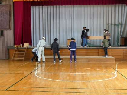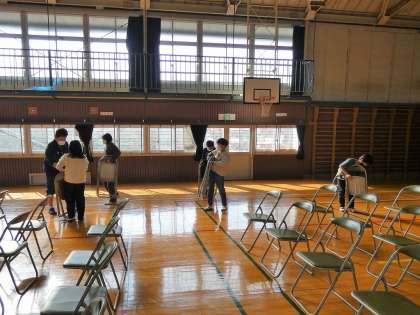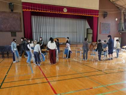 5年生児童と職員とで、体育館の卒業式式場準備をしました。5年生は、椅子並べやひな壇の設置など、とてもよく働いてくれました。