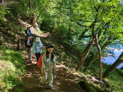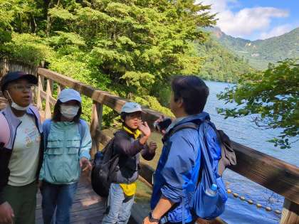 久しぶりの晴れだそうです。湯の湖を半周します。