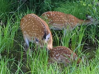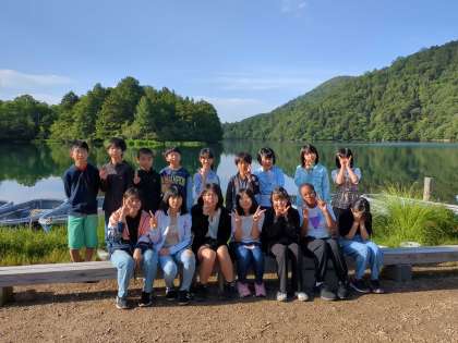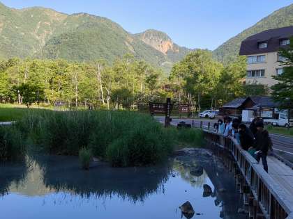 おはようございます。宿舎の前で体操をして、湯の湖畔に来ました。温泉が湧いているところを見て来ました。鹿の親子も出迎えてくれました。