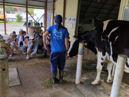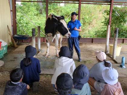 鷹山牧場に着きました。牛のアイリスちゃんに乳搾りをさせてもらいます。