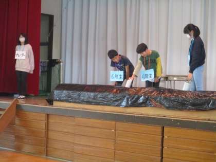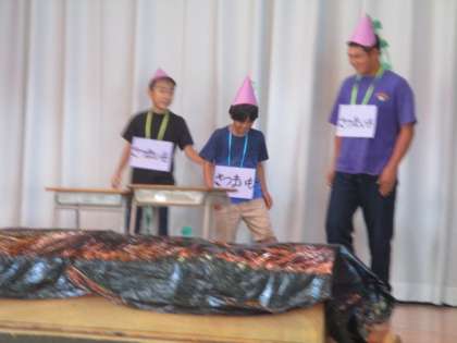 6年生がサツマイモの成長を劇でやりました。田を耕して、マルチをして、苗を植えて。