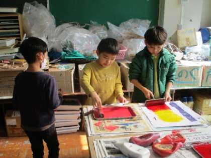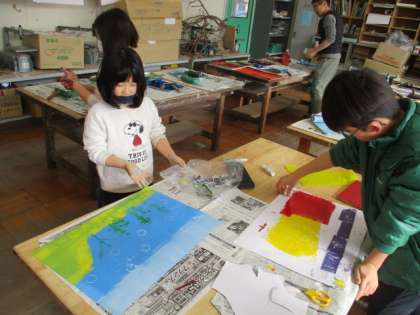 図工「いろいろ うつして」版画作品ですが、いろいろな物に色を付けてスタンプしていきます。みんな、楽しそうに活動していました。