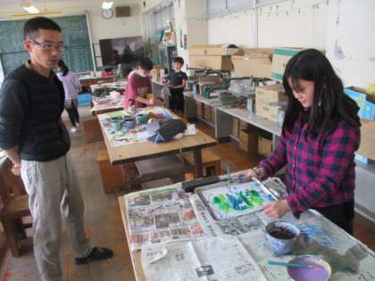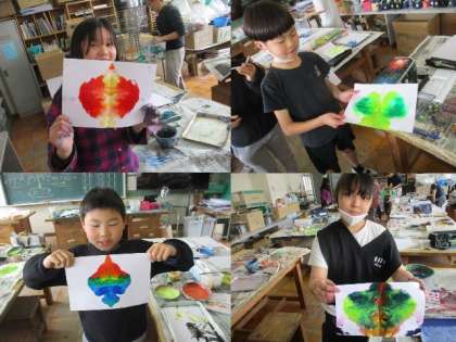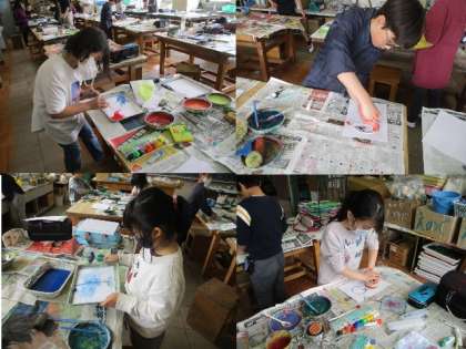 図工の時間にお邪魔しました。「絵の具でゆめもよう」いろいろな物を使って、自分だけのオリジナルアートを完成させていました。