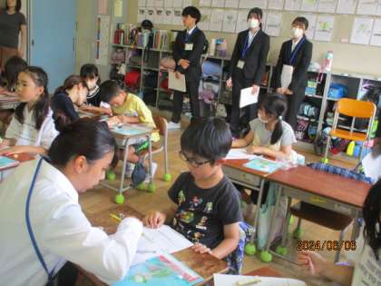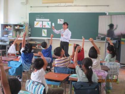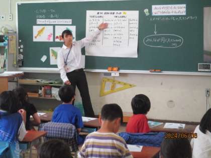 教育実習生の算数の授業でした。長さの学習をしっかり行っていました。終始笑顔で授業をする先生と楽しそうに学習していました。