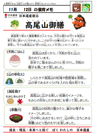 今日は「高尾山御膳」です。高尾山にまつわるさまざまなものをイメージした献立になっています。