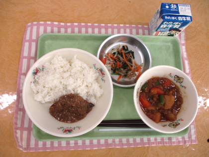 カムジャタンは韓国の伝統的な鍋料理で、じゃがいもと骨付きの豚肉をじっくり煮込んだ料理です。ニンニクや唐辛子を使うので、うまみたっぷりで体の芯から温まります。給食ではじゃがいもや豚肉の他に、にんじんやたまねぎなどの野菜を加え、豆板醤を使ってピリ辛の肉じゃが風にしました。