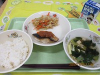 ごはん 焼き魚(鮭) 豚肉とキャベツのみそ炒め かきたま汁 牛乳今日11月11日...