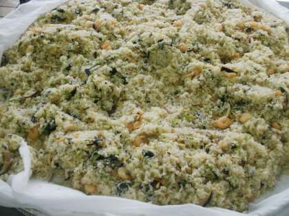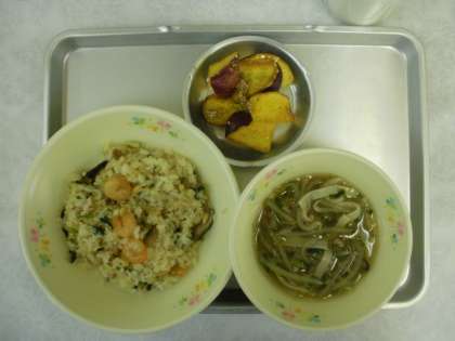 おこわは、強飯(こわめし)とも言い、かたいごはんを指します。普通食べるものはうるち米ですが、おこわにはもち米が入っています。もち米はモチモチしていて甘くちょっとかたいのが特徴です。昔、もち米は貴重で、お祭りやお正月などの特別な日でないと食べられませんでした。甘いものが手に入りにくく、とっても高かったからです。中華おこわは、ちまきから来ていて、和風では栗やキノコ、ウメ、山菜等季節のものを入れてるのに対して、中華では、桜エビ、タケノコ、シイタケなどを入れ砂糖じょう油とごま油で味つけをしています。今日はもち米100%で作りました。さつま芋のあめ煮もごま油を使い中華風に仕上げました。