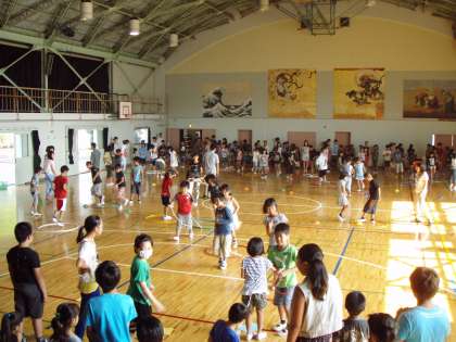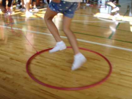 今日は「フラフープ」リレーを行いました。1・2年生はフープの中を歩く(走る)ことができますが、3年生以上はケンケンをしながら、移動していきます。意外に難しそうで、フープが足に引っかかってしまう人がたくさんいました。