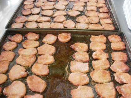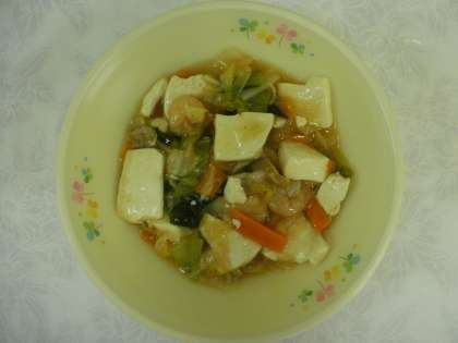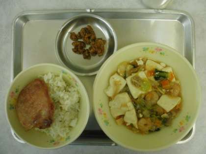豚肉の切り身に、にんにく・根しょうが・酒・砂糖・みりん・しょうゆで下味をつけて、オーブンで焼きました。ごはんが進む一品です。また、海鮮豆腐にはたっぷりと野菜を使いました。干しほたて貝柱の味がきいて美味しく出来ました。