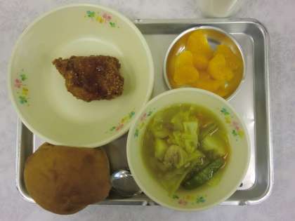 イカフライをパンにはさんで食べました。イカは種類が多く、約500種類知られていますが、そのうち約30種類が食用とされています。日本人はイカをよく食べる国民で、捕獲量、消費量とも世界一です。イカは脂質や糖質の少ない低カロリー食品で、からだをつくるたんぱく質が豊富です。