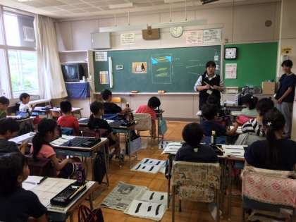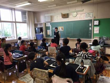 初めて毛筆を使う三年生のために中学の国語の先生が教えに来てくださいました。