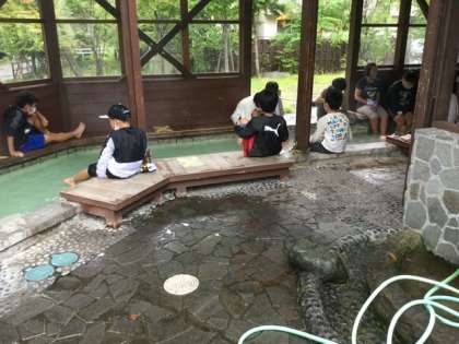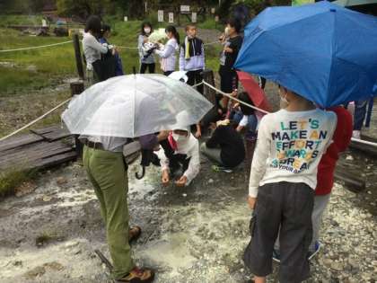 雨には降られましたが、源泉を見学し、足湯もいただきました。