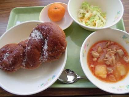 揚げパン・チキンのトマト煮込み・フレンチサラダ・冷凍ミカン・牛乳