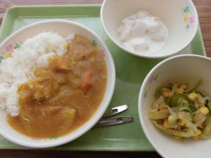 チキンカレーライス・豆サラダ・ピーチヨーグルト・牛乳