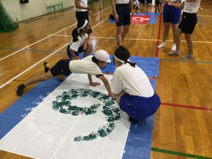 小学部1年生から中学部3年生が手形を押して、それぞれ団旗を作ります。
