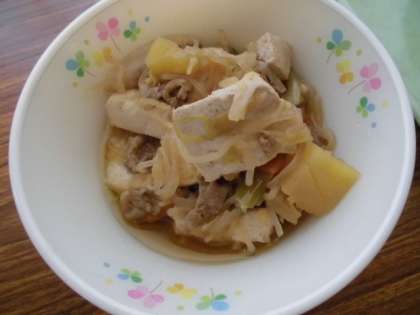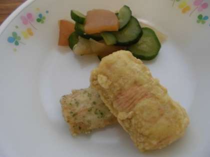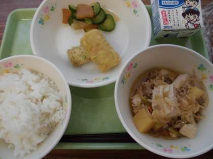 ご飯・豚すき焼き風煮・竹輪の二色揚げ・キュウリと大根の南蛮漬け