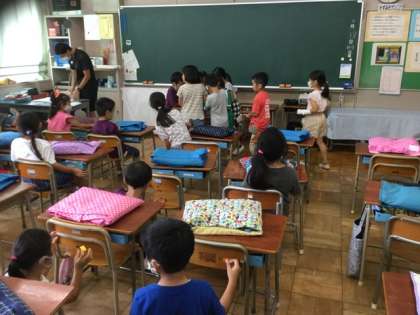 1年生が、2種類のテープを椅子に貼って準備をしていました。