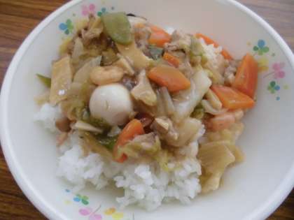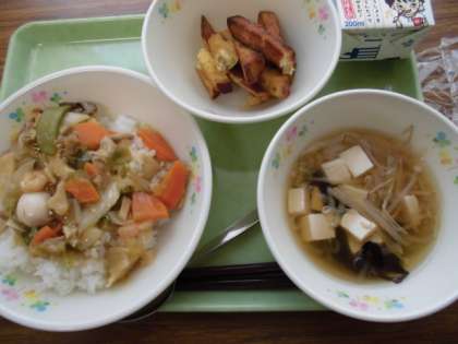 中華丼・豆腐とキクラゲのスープ・揚げ芋のあんがらめ・牛乳