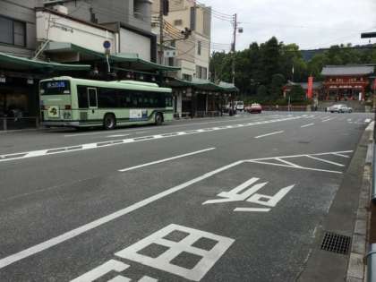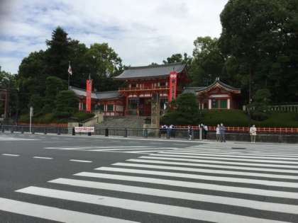 撮影地は、祇園の交差点です。八坂神社が見えます。