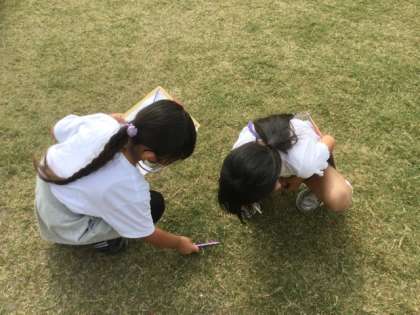 中 小1が校庭で生き物を探しているところです。てんとう虫を見つけた場面です。