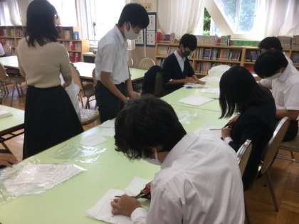 右 中3が合唱コンクール用の手作りマスクの裁断をしています。何と全校生徒分です。