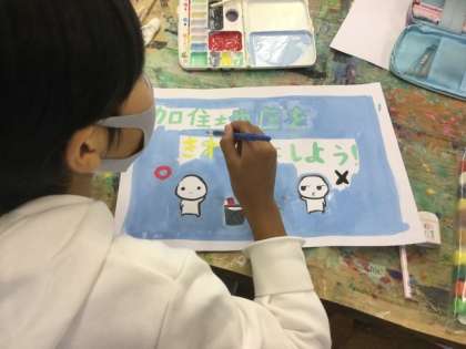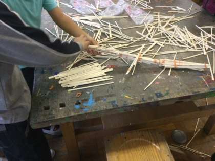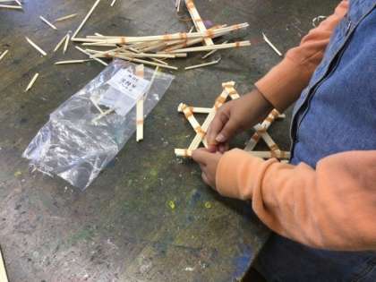 2校時、ポスターづくりと割り箸を繋げて作品を作っていました。