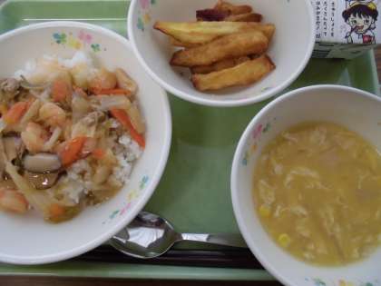 中華丼・揚げいもの飴がらめ・コーンと玉子のスープ・牛乳