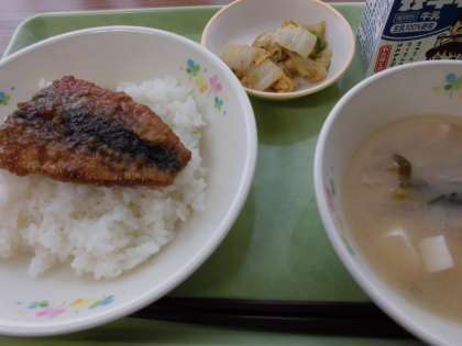 サンマの蒲焼き丼・ピリ辛白菜・味噌汁・牛乳