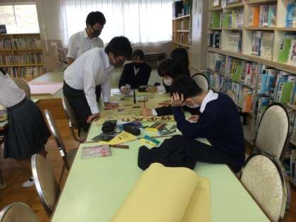 右 中3総合。修学旅行のまとめが完成間近。学習発表会をお楽しみに!