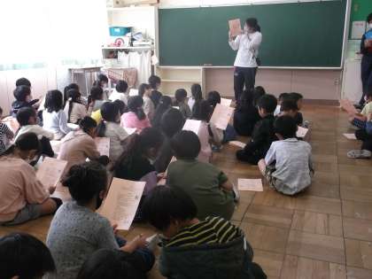 しおりをしっかりと見ながら、先生の話をよく聞いています。