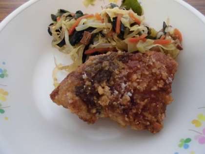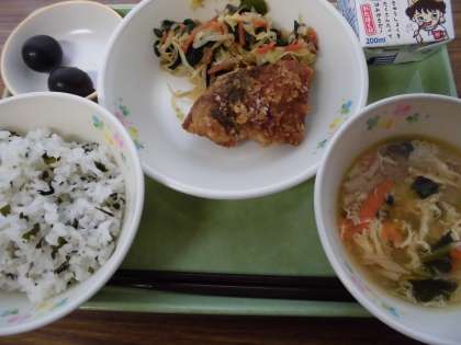 わかめご飯・白身魚の香り揚げ・中華サラダ・きのこと玉子のスープ・