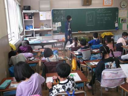 どの子も丁寧に色を塗っていました。この絵と文章は、この後の国語の学習で使用するようです。