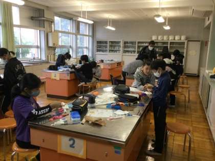 1校時、マスクづくりをしています。