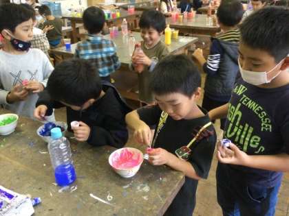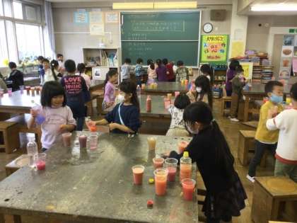 図工 絵の具を混ぜて、色水を作ってました。