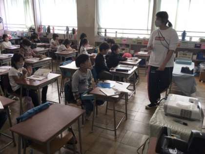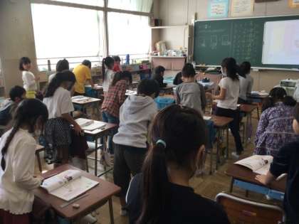 右の写真は、クラス全員で5の段を言ってます。