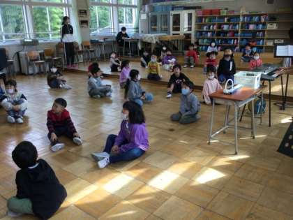 2校時、『じゅういっぴきのねこがたびにでた』を歌っています。