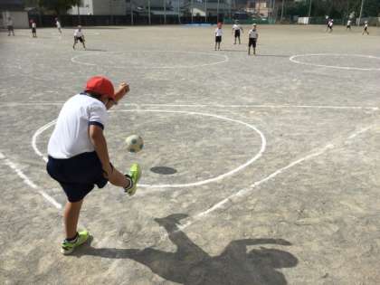 3校時、校庭でキックベースをしています。