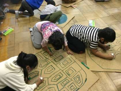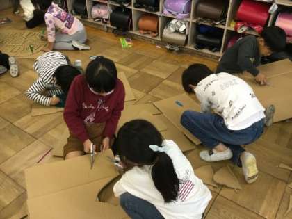 段ボールを切ったり絵を描いたり、紙を丸めていました。