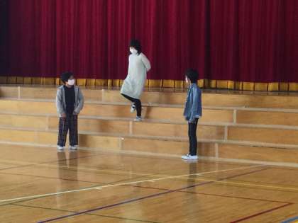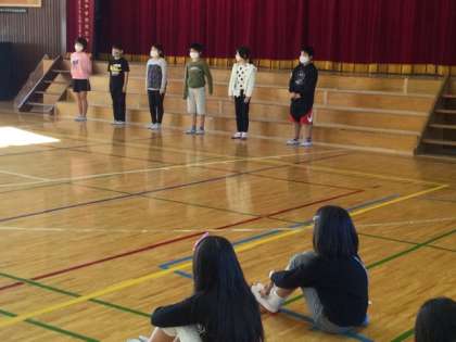 声の大きさやセリフを言う速さを確認しながら練習しています。