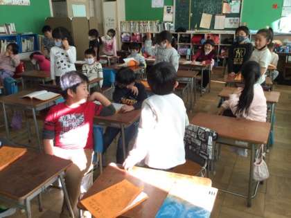 5校時、教室で劇の練習です。