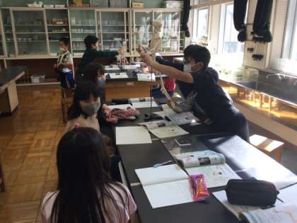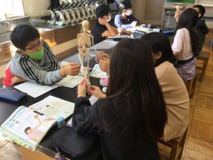3校時、人体骨格模型で観察しています。