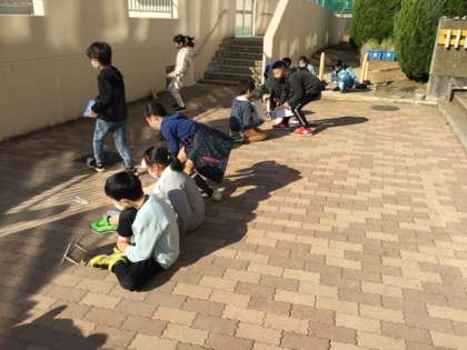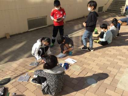 1校時、屋外で実験をしています。