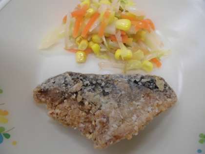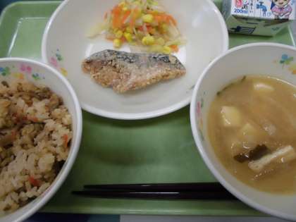 炊き込みご飯・鯖の竜田揚げ・温野菜サラダ・味噌汁・牛乳