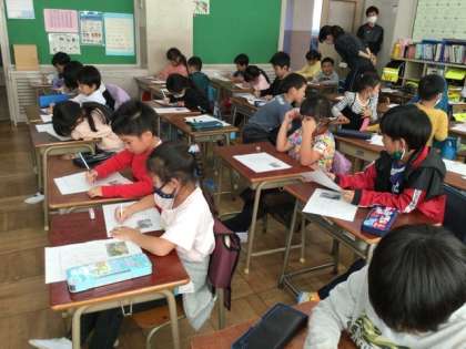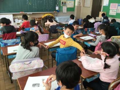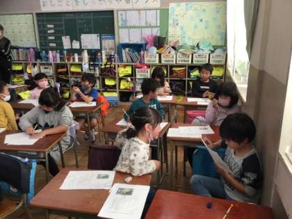 5校時、吹き出し言葉を使って蝶の写真について、お話を作っています。
