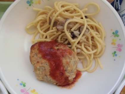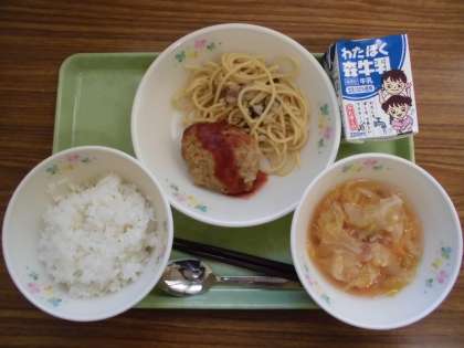 ご飯・レンコンハンバーグ・きのこスパゲティ・ミネストローネ・牛乳