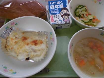 ミルクパン・マカロニグラタン・イタリアンサラダ・コンソメスープ