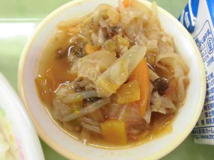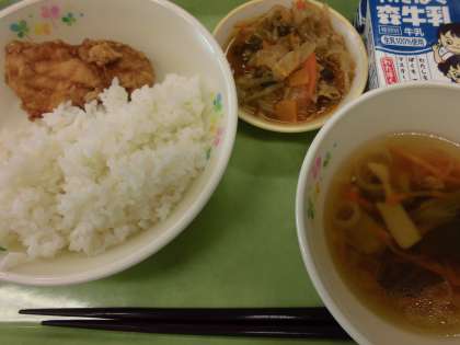 ご飯・鶏の唐揚げ・豚キムチ炒め・春雨スープ・牛乳