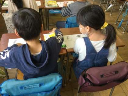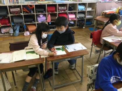 マスクを付けて、隣同士で話し合います。